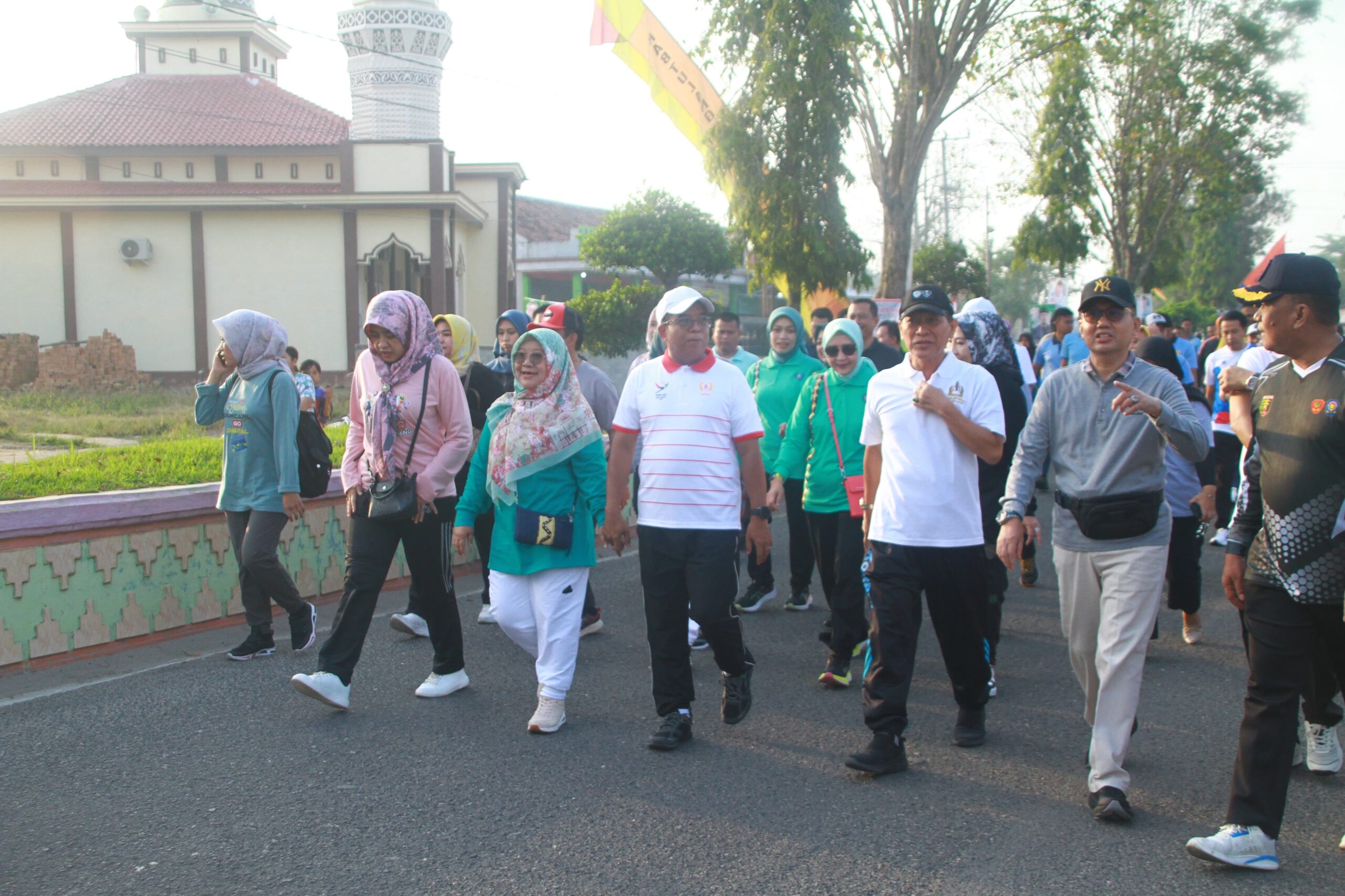 Pj Gubernur Samsudin melepas peserta jalan sehat dengan penuh semangat dari Lapangan Terminal Menggala, dan seluruh peserta melakukan perjalanan menuju garis finis di lokasi yang sama.