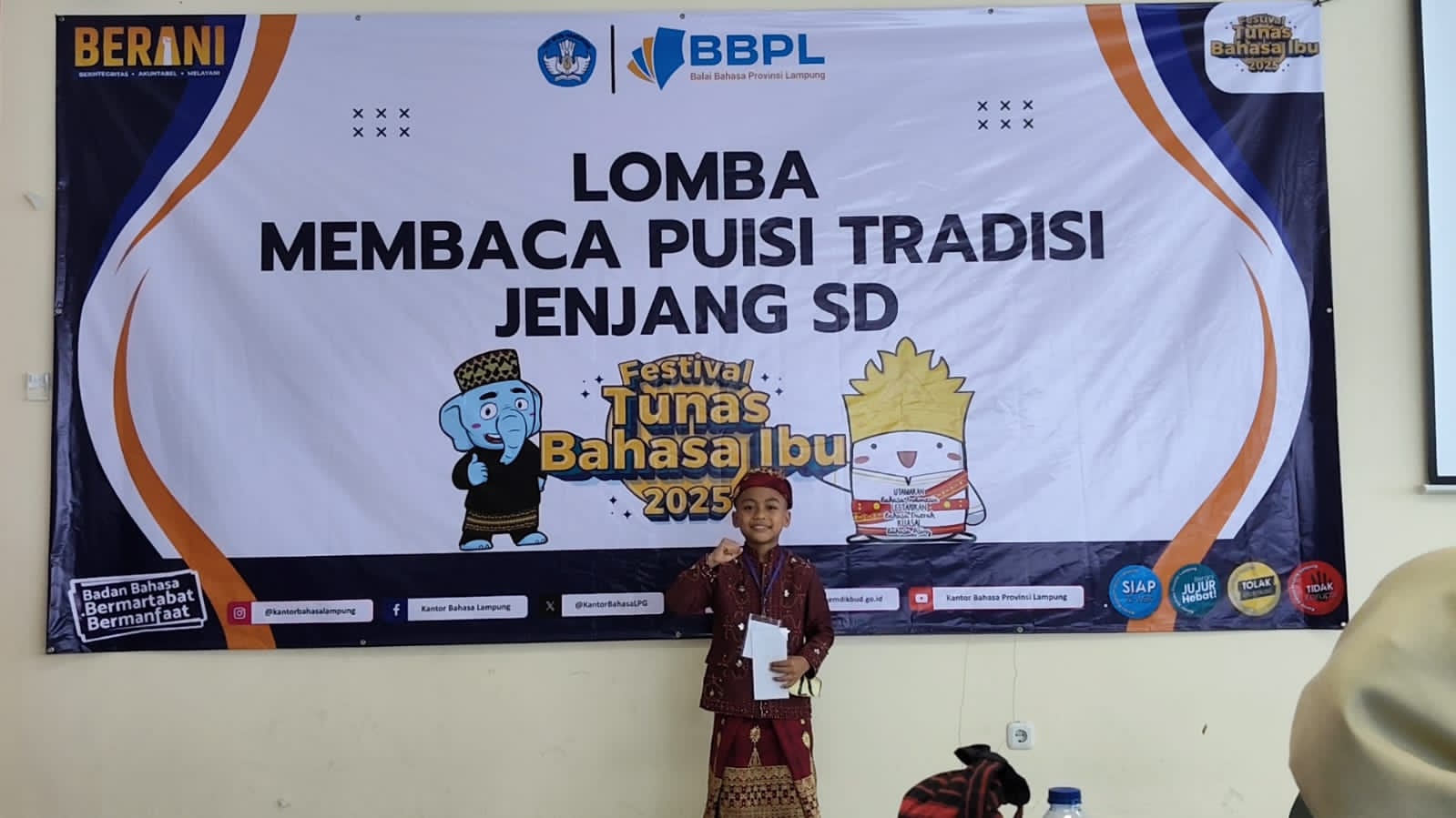 Hariannaskah, Tulang Bawang— Kabar membanggakan datang dari SDN 01 Gunung Sakti. Salah satu siswanya, M. Azzam Raffasya Halim, berhasil meraih Juara 1 Umum dalam ajang Festival Tunas Bahasa Ibu (FTBI) kategori Membaca Puisi Tradisi Jenjang SD tingkat Provinsi Lampung, dan kini berhak melaju untuk mewakili daerah ke tingkat nasional.