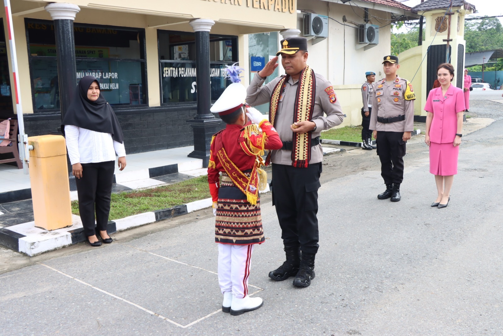 Lalu dilanjutkan dengan pengalungan kain tapis oleh Polisi Cilik (Pocil) kepada Kapolres Tulang Bawang, kemudian jajar hormat (jarmat) oleh regu samapta, dan Wakapolres memperkenalkan para PJU Polres, Kapolsek jajaran dan perwira Polres.