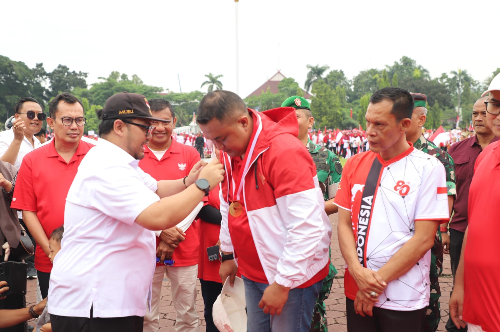 Piagam penghargaan diterima langsung oleh Bupati Bogor, Rudy Susmanto dari perwakilan MURI usai pelaksanaan Kirab Bendera Merah Putih, di Lapangan Tegar Beriman, Cibinong, Kamis (14/8).
