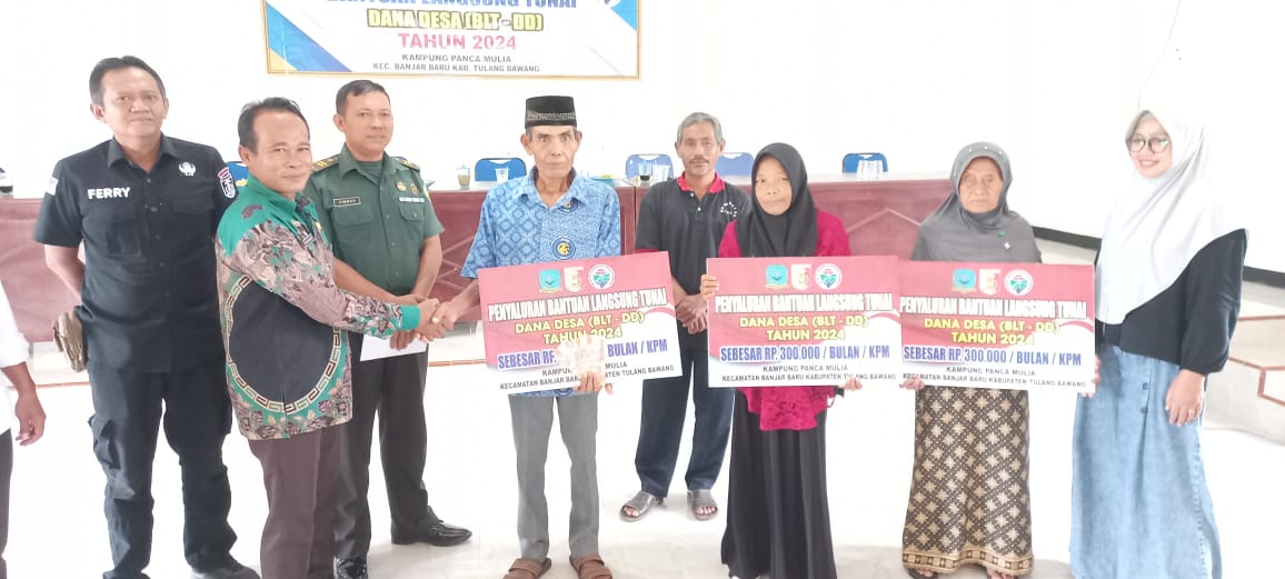 Harian Naskah, Tulang Bawang- Kepala kampung (Kakam) Panca Mulia, Asep Imanudin, menghadiri sekaligus menyalurkan bantuan langsung tunai dana desa (BLT DD) tahun 2024, di balai kampung setempat, kecamatan Banjar Baru, Jum’at 8 Maret 2024.