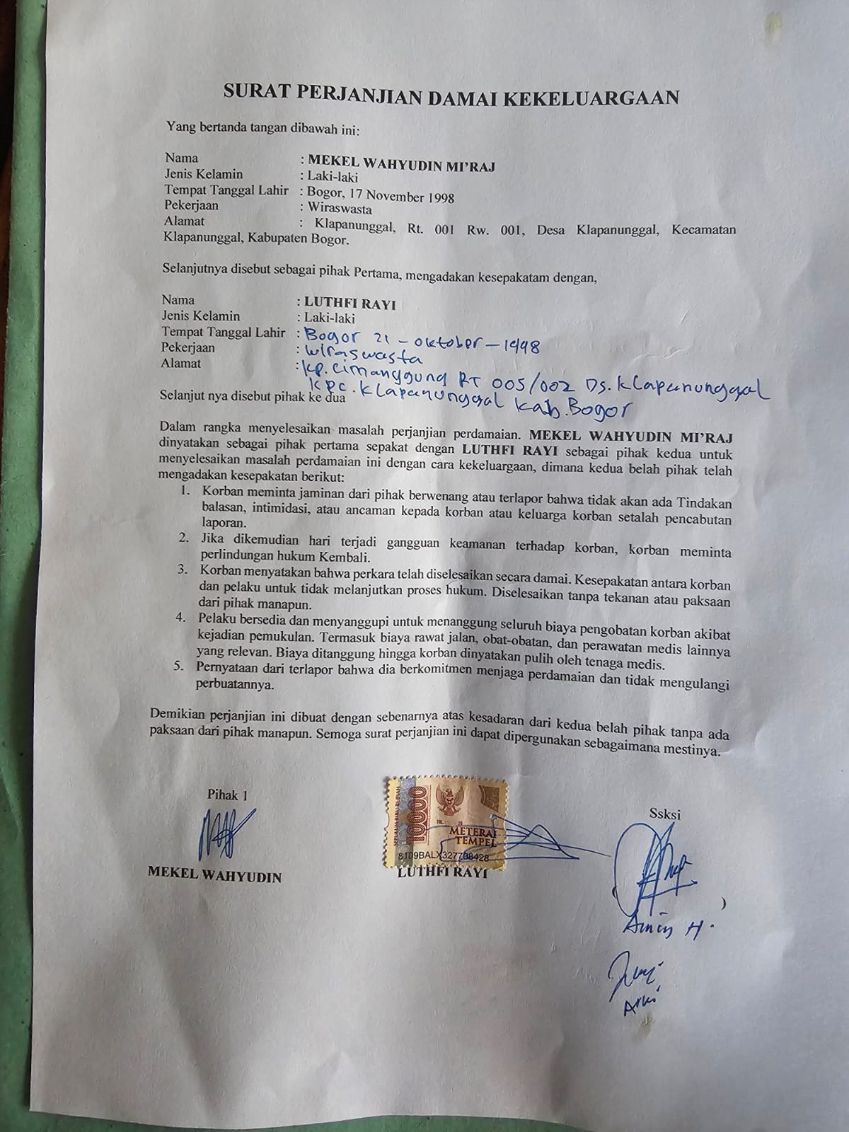 Hariannaskah, Bogor- Kasus pemukulan yang dilakukan oleh LR, anak Kades Klapanunggal, terhadap warga desa setempat, MW, telah mencapai titik akhir dengan pencabutan laporan polisi oleh pelapor. MW secara ikhlas dan berdasarkan kemanusiaan memutuskan untuk mencabut laporan dan keterangannya, setelah melakukan kesepakatan damai dengan pihak LR.
