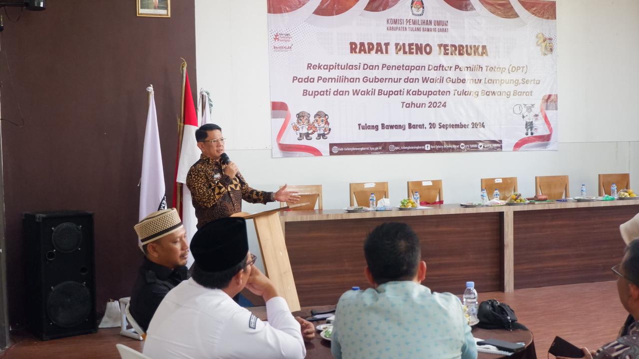 Harian Naskah, TUBABA- Komisi Pemilihan Umum (KPU) Tulang Bawang Barat (Tubaba) bersama Pemerintah Kabupaten Tubaba menggelar rapat Pleno Terbuka Rekapitulasi dan Penetapan Daftar Pemilih Tetap (DPT) pada pemilihan Gubernur dan Wakil Gubernur Lampung serta Bupati dan Wakil Bupati Kabupaten Tubaba. Jum’at (20/09/2024).