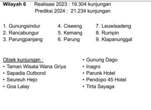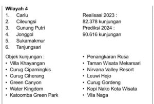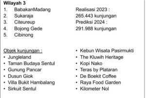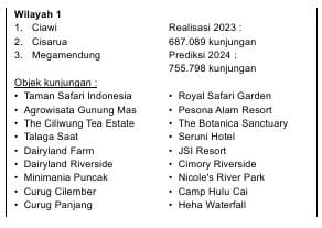 Khusus pada waktu liburan natal dan tahun baru ini (22 Desember 2024 s/d 7 Januari 2025) diprediksi bahwa kunjungan wisatawan ke Kabupaten Bogor akan mencapai 1,2 juta, naik 10% dari jumlah kunjungan wisatawan saat libur Nataru tahun sebelumnya, dan wilayah yang menjadi penyumbang kunjungan wisatawan terbanyak adalah Kawasan Puncak, yaitu sebesar 60%. Namun tempat wisata di Kabupaten Bogor bukan hanya Puncak. Banyak tempat wisata lain yang daya tariknya tidak kalah dengan yang ada di Kawasan Puncak. Sebagai informasi berikut ini adalah daya tarik wisata yang ada di Kabupaten Bogor berdasarkan wilayah dan potensi jumlah kunjungan wisatawan: