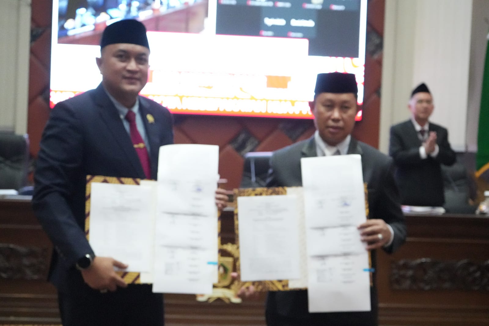 Penandatanganan dilakukan secara langsung oleh Pj. Bupati Bogor, Asmawa Tosepu dan Ketua DPRD Kabupaten Bogor, Rudy Susmanto, di Ruang Rapat Paripurna DPRD, Cibinong, Selasa (20/8). Hadir jajaran Wakil Ketua dan Anggota DPRD Kabupaten Bogor, Pj. Sekretaris Daerah beserta jajaran Pemkab Bogor.