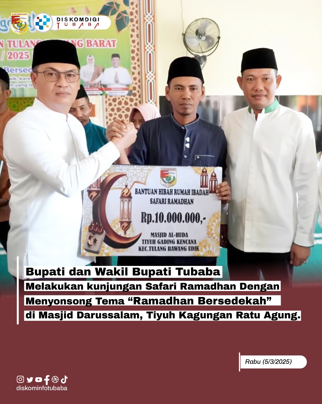 Tulang Bawang Barat- Bupati Tulang Bawang Barat (Tubaba) Ir. Novriwan Jaya, S.P, bersama Wakil Bupati Tubaba Nadirsyah, beserta jajaran Forkopimda melakukan kunjungan Safari Ramadhan Dengan Menyonsong Tema “Ramadhan Bersedekah”