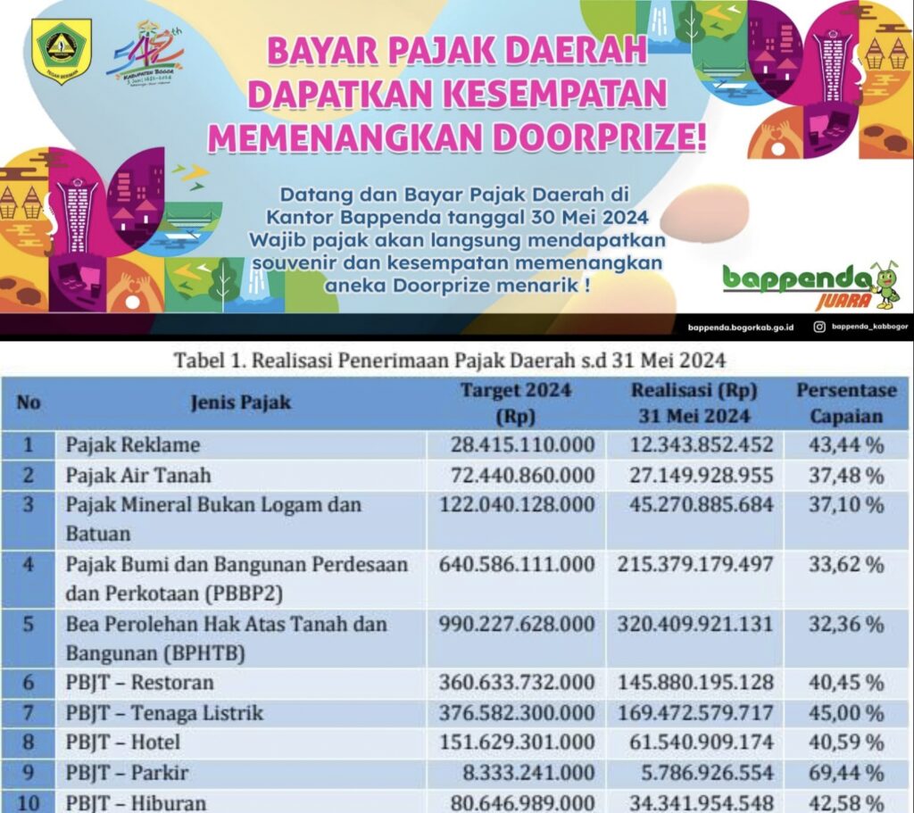 Strategi-strategi tersebut berdampak terhadap meningkatnya penerimaan pajak daerah di Wilayah Kabupaten Bogor, hal tersebut dapat dilihat pada pencapaian kinerja Bappenda Kabupaten Bogor pada sektor penerimaan Pajak Daerah s.d 31 Mei 2024 dibawah ini.