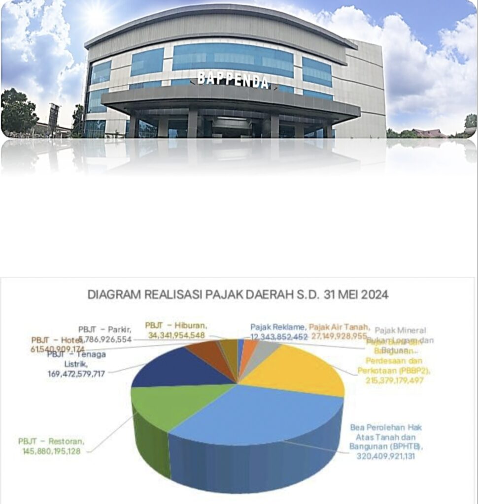 Pencapaian realisasi pajak daerah untuk 10 jenis pajak daerah sampai dengan tanggal 31 Mei 2024 adalah sebesar Rp 1.037.576.332.840,00 atau 36,64 % dari target yang telah ditetapkan dalam Anggaran Tahun 2024 sebesar Rp 2.831.535.400.000,00 dengan rincian realisasi penerimaan sebagai berikut:
