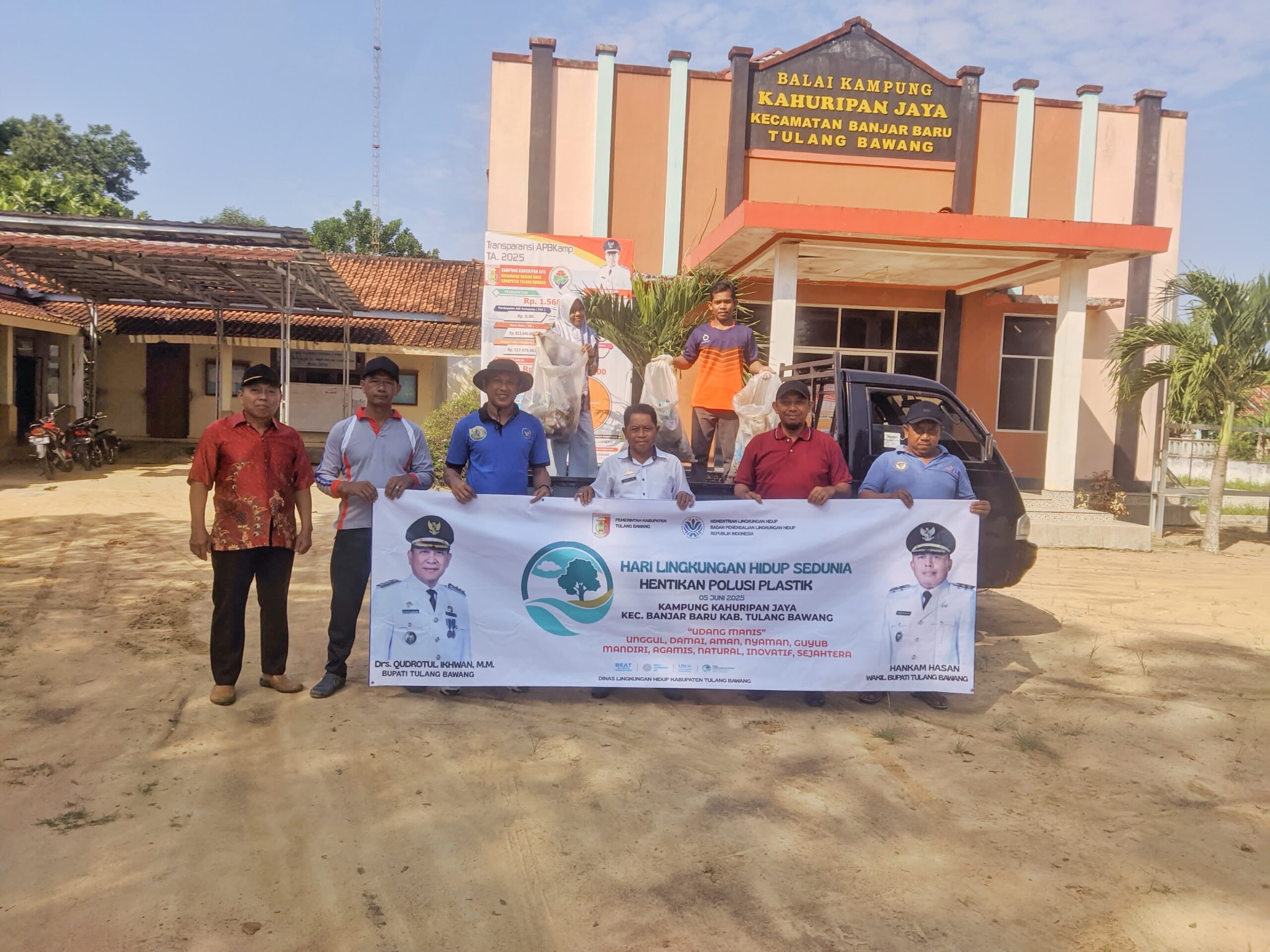 HN, Tulang Bawang- Dalam rangka memperingati Hari Lingkungan Hidup Sedunia tahun 2025, Pemerintah Kampung Kahuripan Jaya, Kecamatan Banjar Baru, Kabupaten Tulang Bawang menyelenggarakan kegiatan aksi bersih sampah plastik, Kamis (5/6/25).