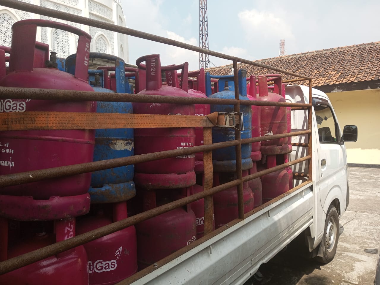 Mobil pickup warna Putih dengan nomor Polisi B 9441 TVA yang diamankan tengah membawa puluhan tabung gas isi Non subsidi 12 kilogram warna pink di jalan Raya Narogong – Bekasi Cileungsi kabupaten Bogor, provinsi Jawa Barat.