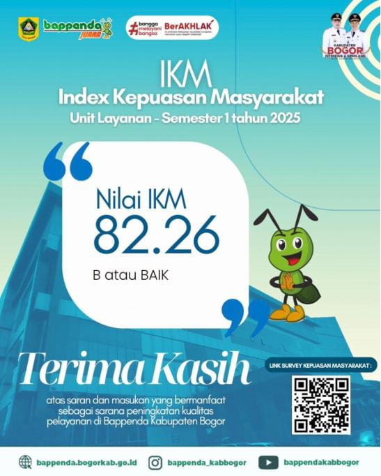 Bappenda Kabupaten Bogor mengucapkan terima kasih sebesar-besarnya atas saran dan masukan yang telah diberikan selama ini. Komitmen pelayanan yang berakar pada nilai AKHLAK dan semangat inovasi akan terus dijaga, agar seluruh masyarakat benar-benar merasakan manfaat pelayanan yang cepat, akurat, dan ramah.