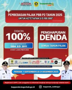 Mulai 1 September hingga 31 Desember 2025, masyarakat dapat memanfaatkan diskon 100% untuk PBB P2 tahun pajak 1994 hingga 2011, asalkan telah melunasi PBB P2 tahun 2025. Untuk wajib pajak yang nilai ketetapan pajaknya maksimal Rp100.000,- Pemerintah Kabupaten Bogor memberikan pembebasan penuh: pajak dianggap langsung lunas untuk tahun 2025 tanpa perlu melakukan pembayaran lagi dan kebijakan ini berlaku tanpa batas waktu.