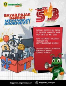 Kegiatan dilaksanakan di Ruang Pelayanan Bappenda Kabupaten Bogor pada Hari Kamis Tanggal 12 Juni 2025, Wajib Pajak yang datang secara langsung untuk melakukan pembayaran pajak mendapatkan souvenir dan berkesempatan memenangkan Doorprize yang menarik. Mulai dari botol minum, payung, handphone, sepeda, logam mulia dan masih banyak lagi hadiah lainnya. Selain berdampak positif terhadap peningkatan penerimaan pajak daerah, antusiasme Wajib Pajak terhadap kegiatan tersebut juga terlihat jelas dari banyaknya Wajib Pajak/Masyarakat yang datang ke Kantor Badan Pengelolaan Pendapatan Daerah (BAPPENDA) Kabupaten Bogor.