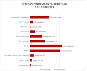 Pencapaian realisasi pajak daerah untuk semua jenis pajak daerah yang dikelola BAPPENDA Kabupaten Bogor sampai dengan tanggal 10 Juni 2025 sebesar Rp1.672.993.429.185,00 atau mencapai 43,82 % dari target yang telah ditetapkan dalam Anggaran Tahun 2025 sebesar Rp 3.817.688.382.057,00, dengan rincian realisasi penerimaan sebagai berikut: