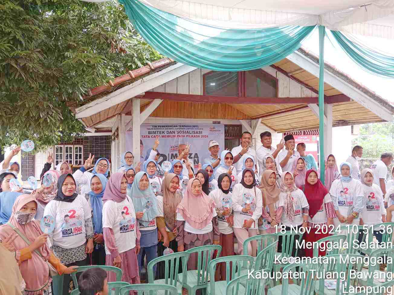 Di tempat yang sama, Ibnu Sani selaku ketua pelaksanan kegiatan Tim Pemenangan Mirza-Jihan Kecamatan Menggala, menyampaikan acara Bimtek dan sosialisasi mengenai tata cara memilih pada Pilkada tahun 2024, yang dilaksanakan tujuannya untuk memberikan pemahaman kepada masyarakat terkait tata cara pemilihan yang benar, agar partisipasi dan kesadaran politik warga semakin meningkat dalam Pemilihan Gubernur (Pilgub) Lampung yang akan dilaksanakan serentak pada 27 November mendatang.