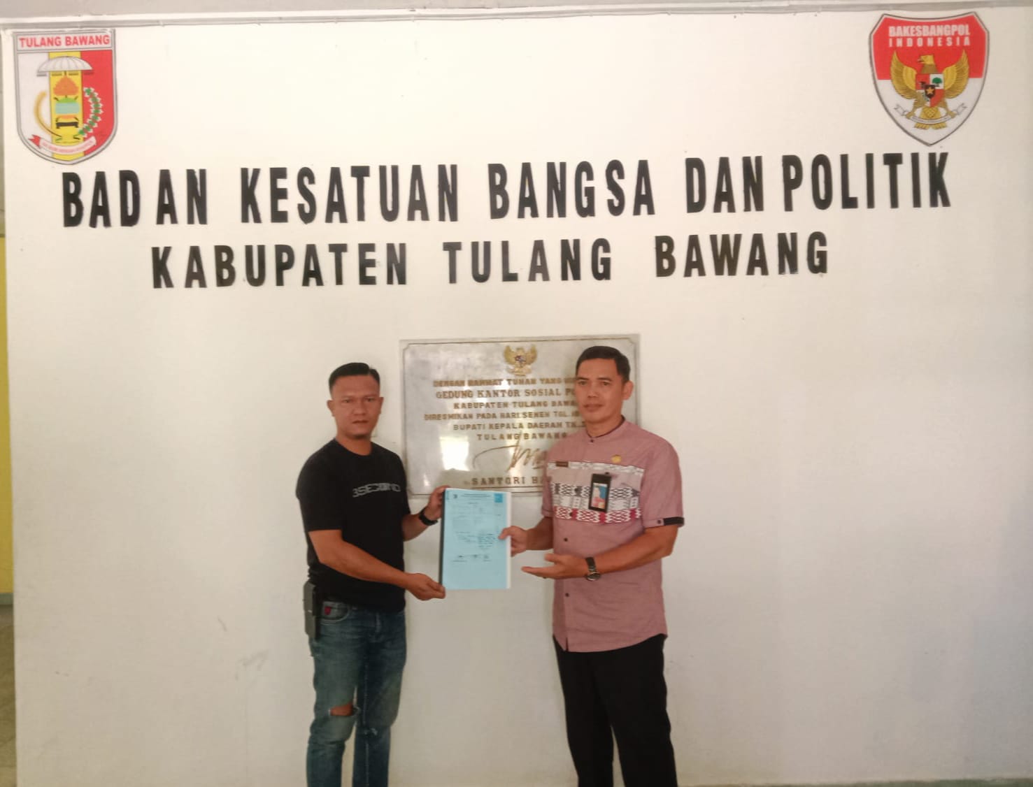 Penyerahan kelengkapan berkas yang telah di tentukan oleh Badan Kesatuan Bangsa dan Politik (Kesbangpol) kabupaten Tulang Bawang di nyatakan telah memenuhi syarat.