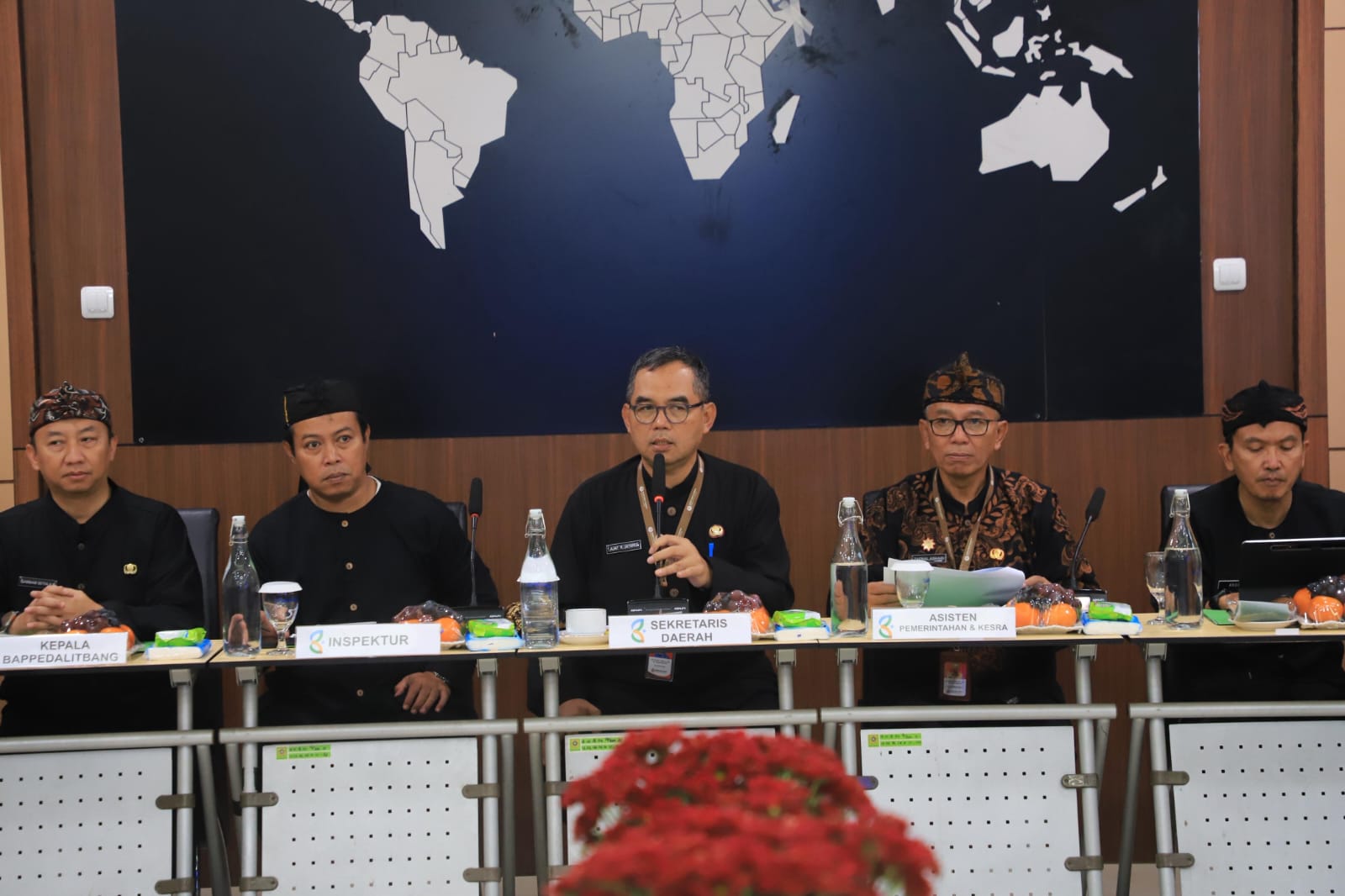 HN, CIBINONG- Mewakili Bupati Bogor, Sekretaris Daerah (Sekda) Kabupaten Bogor, Ajat Rochmat Jatnika pimpin rapat evaluasi progress kegiatan prioritas, di Aula Ciliwung, Bappedalitbang, Cibinong, Rabu (3/7). Ia menekankan pentingnya percepatan dan ketegasan dalam penanganan agenda strategis daerah, khususnya terkait Daerah Otonomi Baru (DOB) dan pembangunan Jalan Khusus Tambang.