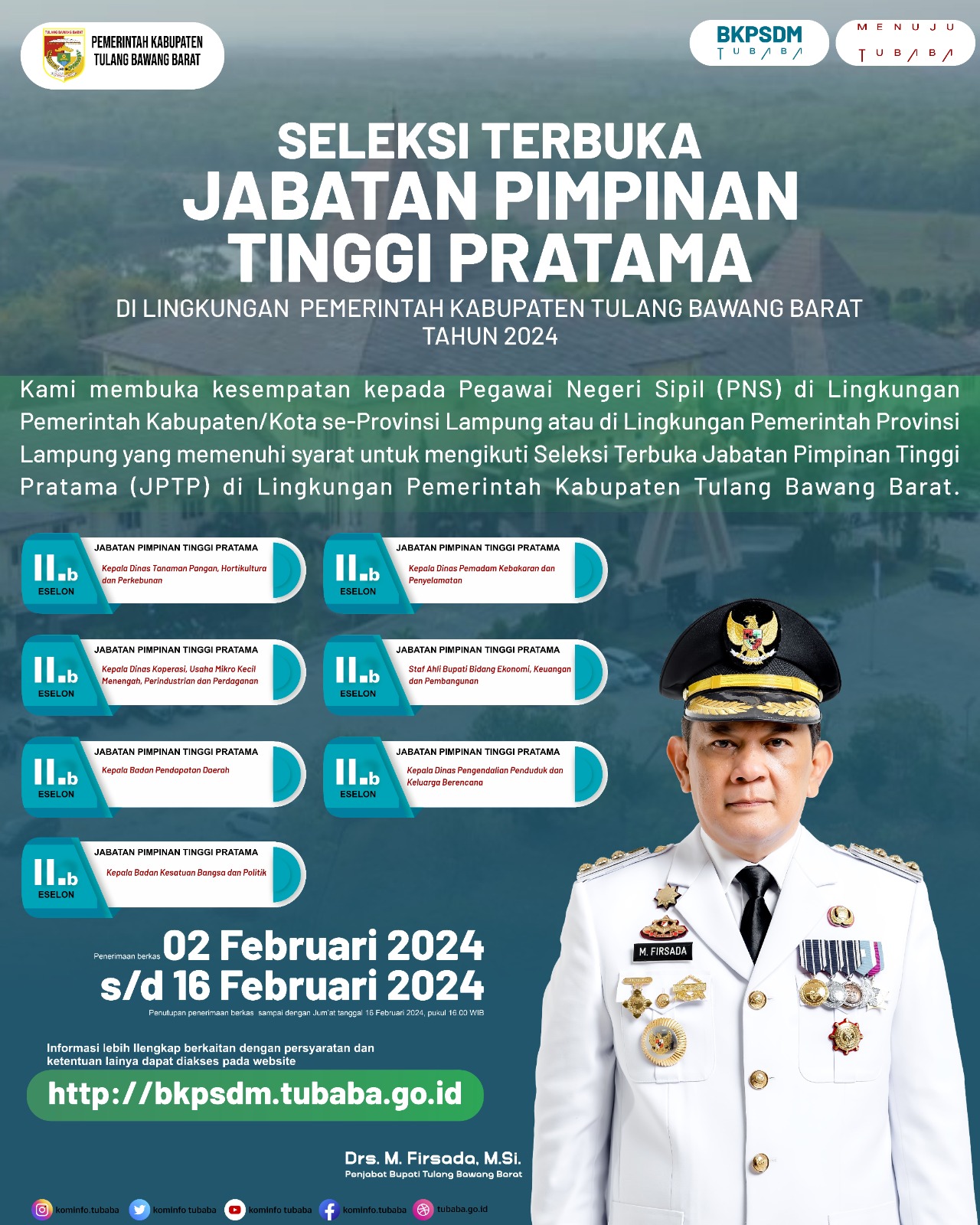 Harian Naskah, Tubaba| Penjabat (Pj) Bupati Tulang Bawang Barat (Tubaba) Drs. M. Firsada, M.Si. menyatakan Pemerintah Kabupaten (Pemkab) Tubaba telah membuka pengumuman seleksi terbuka pengisian 7 (tujuh) Kepala Organisasi Perangkat Daerah (OPD) atau Jabatan Pimpinan Tinggi Pratama (JPTP) yang dimulai 2-16 Februari 2024.