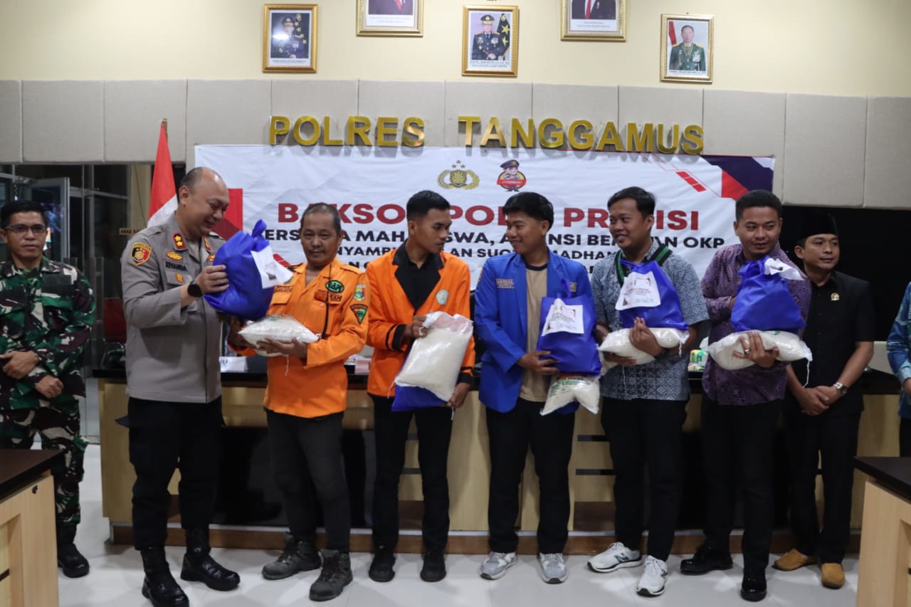 Baksos Jelang Ramadhan, BEM Mahasiswa dan OKP Polres Tanggamus Salurkan Ratusan Paket Bahan Pokok
