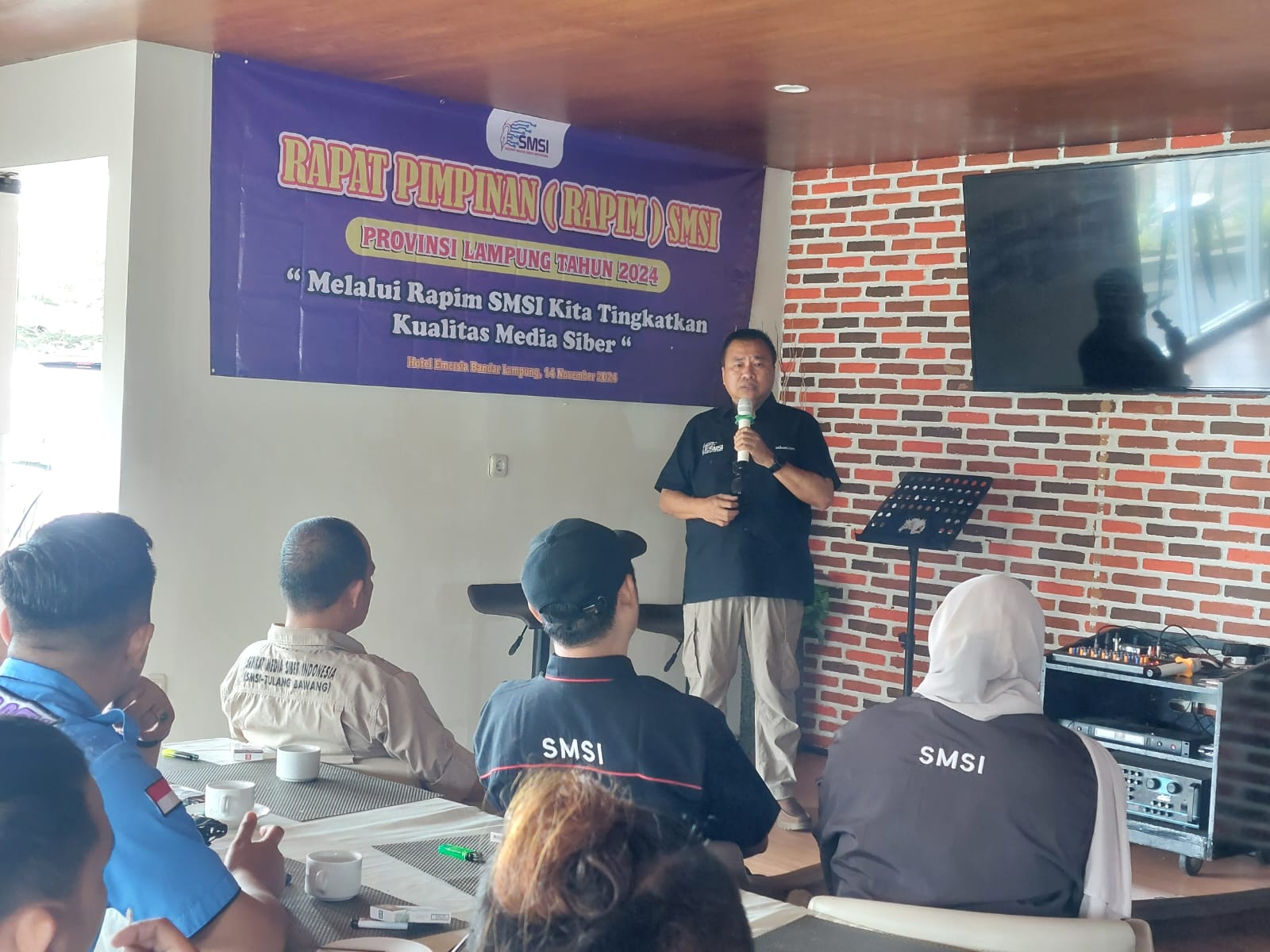 Harian Naskah, Bandar Lampung- Serikat Media Siber Indonesia (SMSI) Provinsi Lampung menggelar Rapat Pimpinan (Rapim) tahun 2024, dengan mengusung tema “Melalui Rapim SMSI Kita Tingkatkan Kualitas Media Siber”, di Hotel Emersia Kota Bandar Lampung, pada Kamis (14/11/2024).