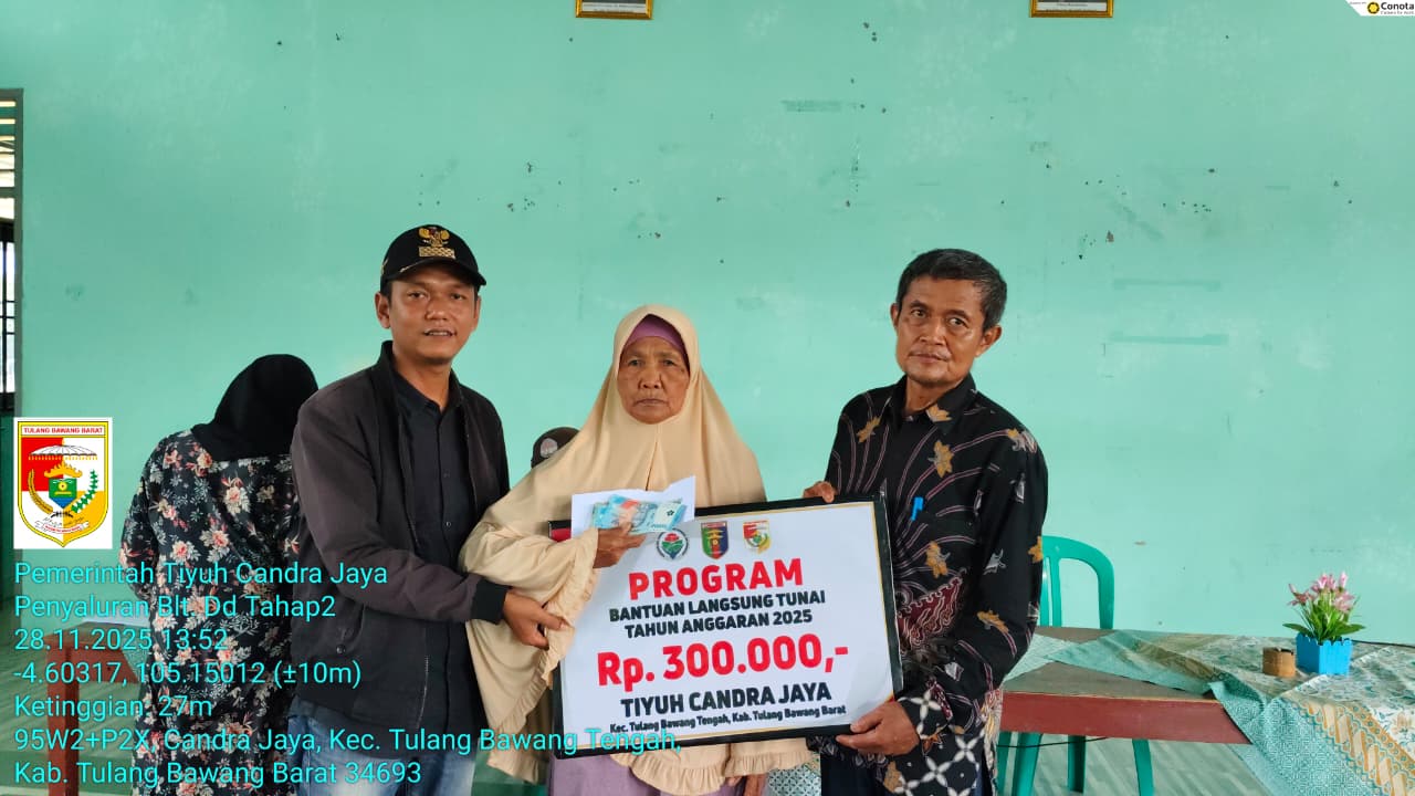 Disampaikan Kepalo Tiyuh Candra Jaya, Salim di dampingi ketua BPT, Wahyu Hidayat, bantuan dari anggaran Dana Desa yang diberikan pemerintah Tiyuh Candra Jaya, Kecamatan Tulang Bawang Tengah, kepada masyarakat yang berhak menerimanya. Dengan jumlah Rp.300.000, perbulan dan disalurkan untuk setiap KPM.
