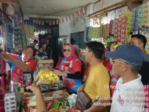 Harian Naskah, TUBA- Paslon Bupati dan Wakil Bupati Tulang Bawang, Winarti-Reynata Irawan (Win-Nata) grebek pasar unit dua Banjar Agung, pada Selasa pagi (19/11/24).